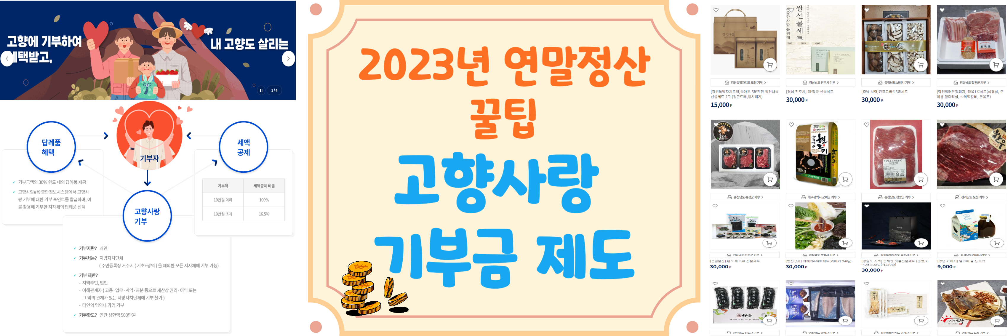 13월의 월급! 연말정산을 슬슬 준비해야 할 시기입니다. 매년 하는 일이지만 할 때마다 헷갈리시죠? 올해 새로 생긴 제도인 "고향사랑 기부금 제도"를 통한 절세 방법을 알아보고, 답례품도 받아 가세요!