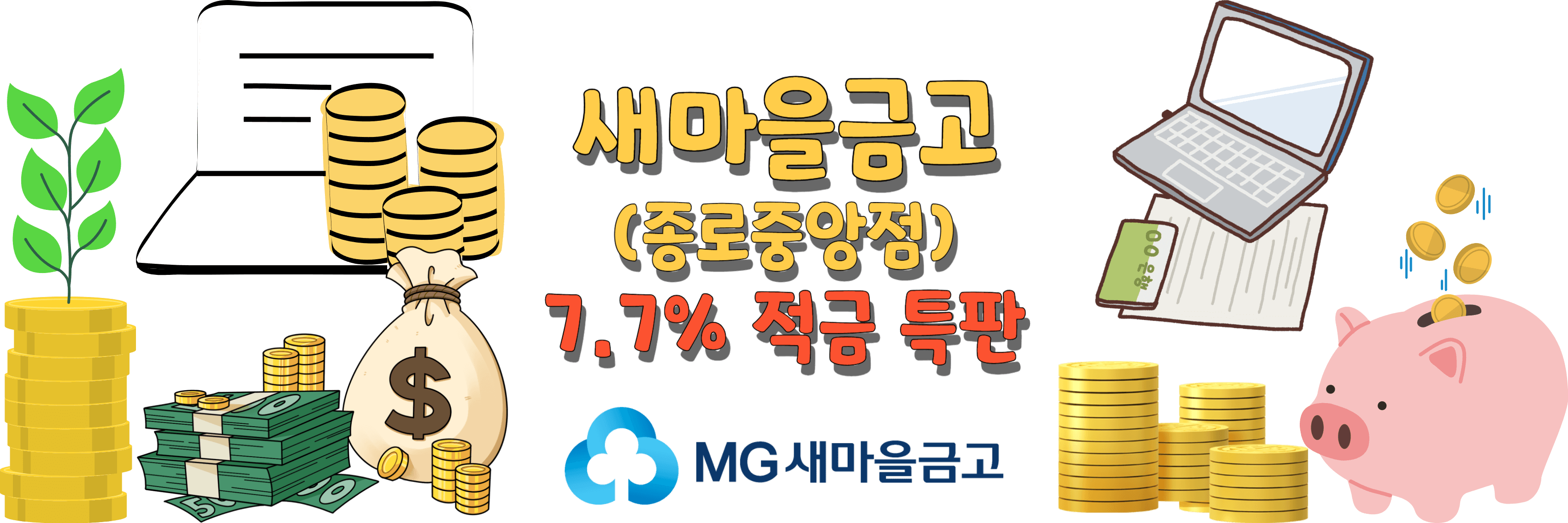 새마을금고 서울 종로중앙점에서 연 7.7%의 고금리 정기적금 특판 상품을 출시했습니다. 이번에 출시한 상품은 새마을금고의 대표 상품인 "MG NEW 정기적금"으로 해당 적금은 각 새마을금고 지점 자체에서 금리를 책정하는 상품으로 서울 종로중앙점만 연 7.7%의 이자가 적용됩니다.